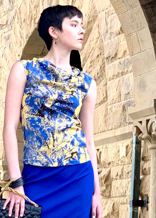 Liquid Cotton Asymmetric Collar Graphic Tee - Blue & Yellow