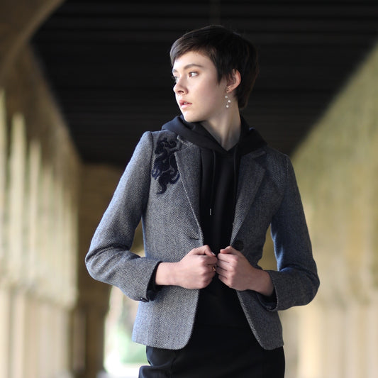 Mandarin Collar Utility Wool Blazer with Signature Embroidery